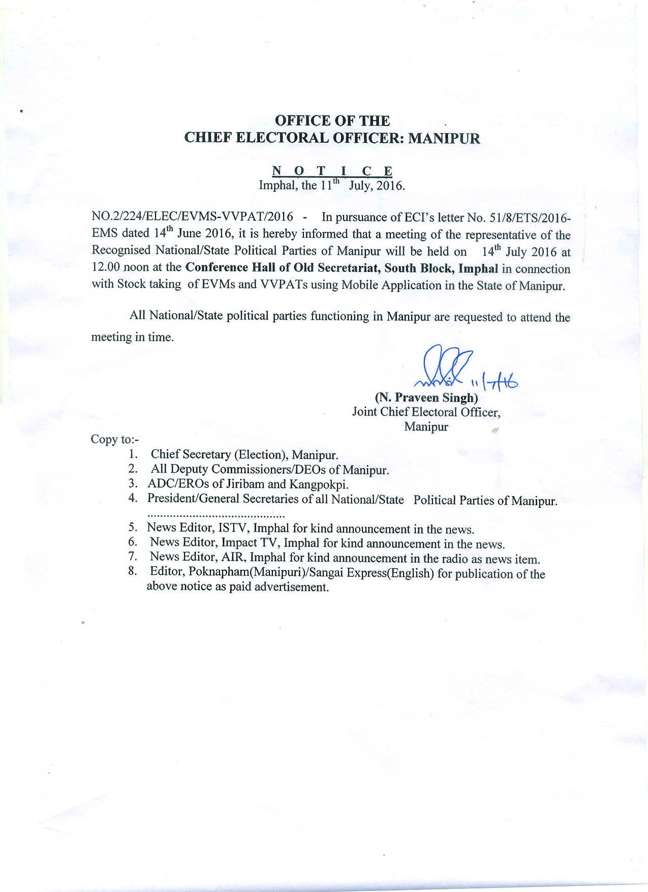 Proceedings of the meeting between CEO, Manipur with DEO/DC and ADC/ERO, held on 9th August, 2016 |